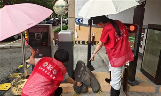 按照应急响应,太平街道月河社区工作人员争分夺秒对小区地下车库等地下空间检查防汛挡板、沙袋等储备情况;将途中道路排水异常现象上报给有关部门及时处置。