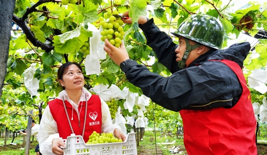 党员志愿者们冒雨采摘葡萄。