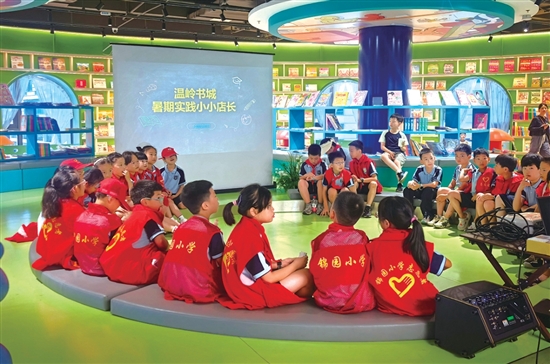 近日,锦园小学的学生们走进温岭书城,开启了一场主题为“乐享‘书’适圈 阅趣嗨翻天”的暑期社会实践活动。孩子们在书架间培养了分类整理的耐心,在收银台前体会到数学与生活的紧密联系,更通过书页的翻动和角色的演绎,真切感受到阅读的温度与想象的力量。