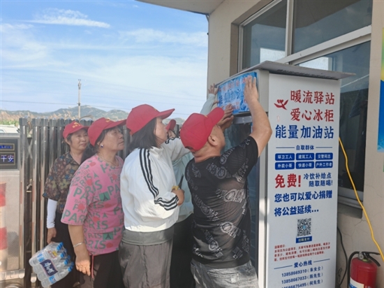 志愿者往“爱心冰柜”里补充矿泉水和饮料。