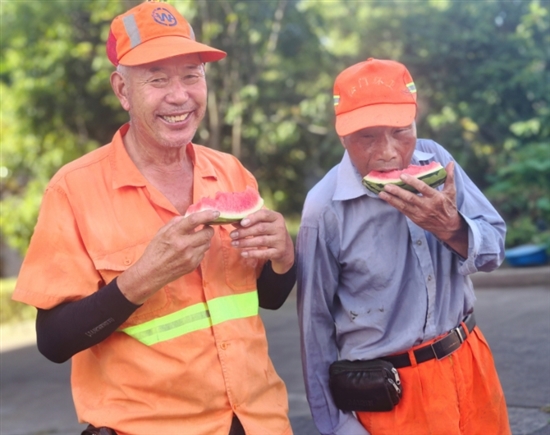 环卫工人在爱心小摊前吃西瓜。