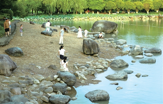 盛夏时节,市区锦屏公园的亲水滩畔化身清凉乐园,成为市民消暑纳凉的热门打卡地。图为7月11日暮色初临时分,市民在亲水滩畔戏水消夏,欢声笑语回荡在粼粼波光之间。