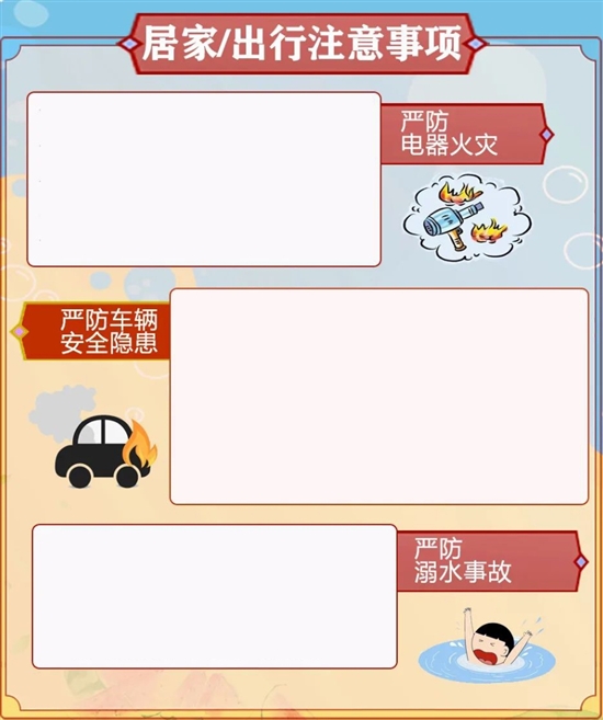 高温天气驾驶汽车、电动车出行前,应检查线路是否老化,轮胎胎压是否过高或鼓包,长途行驶注意休息,让车胎冷却。汽车内请勿放置香水、空气清新剂、打火机等易燃物品,防止因车内温度过高引发火灾。切记任何情况下,都不要将儿童单独留在车内。