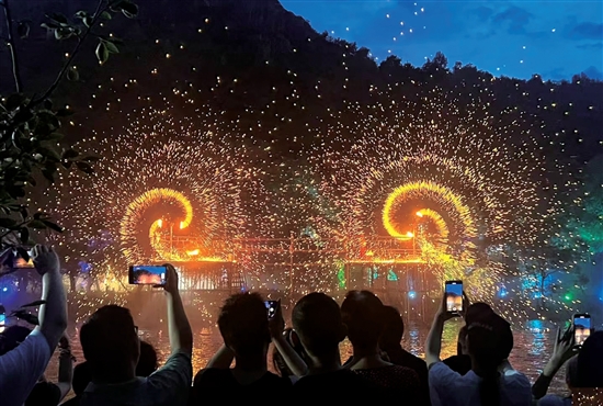 19时许,湖畔传来阵阵喝彩。只见水上飞人踏浪而起,“火凤凰”振翅腾空,烈焰双翼在水幕中划出惊心动魄的轨迹。紧接着,非遗打铁花表演者奋力挥臂,滚烫的铁水泼洒成漫天星雨,将现场气氛推向高潮。