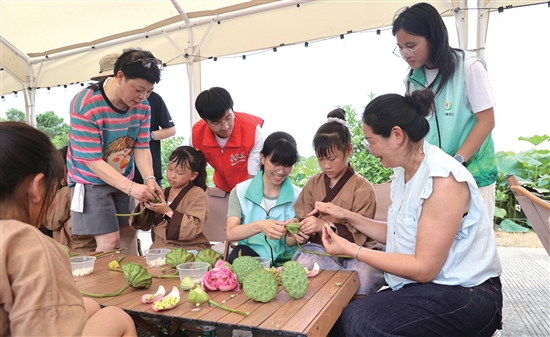“蝉鸣惊半夏,晴光映荷花。”7月16日,在位于箬横镇的星星曙光农业生态园百亩荷花、甲鱼共养基地里,数十名各族职工子女化身“小农夫”,在志愿者的带领下沉浸式参与采莲蓬、剥莲子、钓甲鱼等趣味活动,在生动的自然课堂中解锁夏日研学新体验。