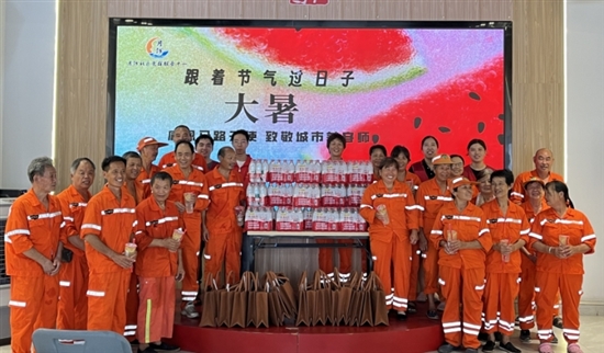 在大暑节气到来之际,太平街道月河社区给辖区内的环卫工人送上节气祝福,准备了遮阳物资、防暑物品、清凉冷饮和水果,向城市美容师致敬。