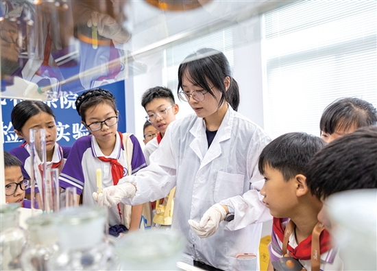 在快检实验室内,法医现场为孩子们演示水质快速检测。当试剂滴入试管,水样瞬间发黄,试管壁迅速发热。“哇!变色了!”“好烫!”孩子们瞪大眼睛,惊叹声此起彼伏。科学取证的严谨与法律的威严,在这个小小实验台前变得无比直观。