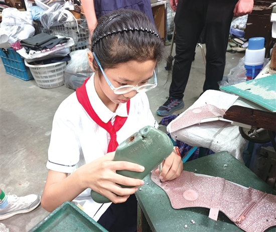 制鞋工艺体验课上,工匠师傅演示完“下料”,同学们便拿起剪刀对着皮料比画起来:“师傅,我的鞋帮剪歪了!”“线脚怎么才能走直?”大家专注地用锥子在皮料边缘扎孔,指尖沾着白胶,额角渗着细汗:“真不容易啊,光把鞋面和鞋底缝在一起,我就拆了三次。”当看到亲手制作的皮鞋稳稳立在桌上时,同学们满是自豪。
