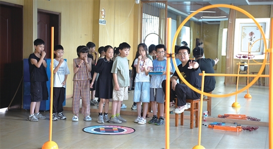 本报讯(记者贾宁欣/文 王博/图)“哇!飞起来了!”“小心,别撞到障碍物!”近日,在城东街道阳光社区的暑托班教室里,一阵阵惊呼和欢笑声此起彼伏。十几名孩子正围在无人机训练赛道旁,手握遥控器,全神贯注地操控着小小的无人机。这是阳光社区联合市青少年宫推出的特色暑托班课程——无人机体验课,为辖区内的孩子们带来一场别开生面的科技启蒙之旅。