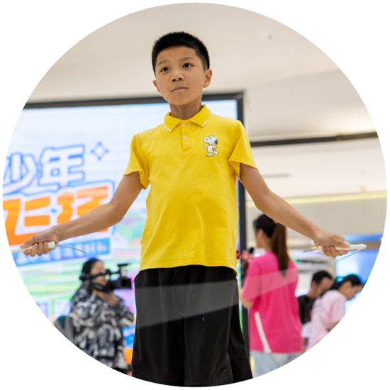 晚上7时,随着主持人的一声令下,孩子们轮番上阵,脚尖轻点,跳绳与地面碰撞出密集的嗒嗒声,双摇、花式跳绳等精彩动作不时呈现,引得现场观众赞叹连连。10岁的卢芊诺虽然没达到目标个数,但她还是十分激动。“现场的氛围特别好,有这么多同龄人和我一起参与,更有劲了。”