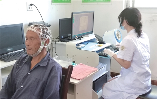 在现场,记者看到,医护人员正为一位老人戴上“帽子”,“帽子”上有许多白点,可以帮助捕捉脑部电信号。几分钟后,系统会自动初步判断脑电图是否有异常。脑电图检查及量表测量等,可为医生筛查早期阿尔茨海默病提供参考。