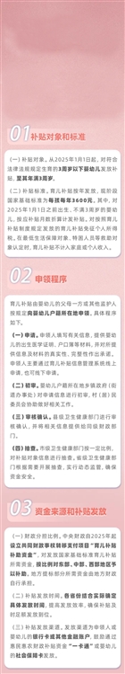 近日,中共中央办公厅、国务院办公厅印发《育儿补贴制度实施方案》。从2025年1月1日起,对符合法律法规规定生育的3周岁以下婴幼儿发放补贴,至其年满3周岁。补贴对象应当具有中华人民共和国国籍。无论一孩、二孩、三孩,均可申领育儿补贴。