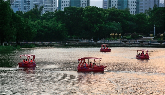 晚霞似锦,凉风习习,在市区锦屏公园,不少市民驾着游船悠然游弋于潋滟湖光之中,尽情享受夏日傍晚的清凉与惬意。