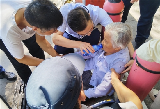 胡建龙来不及多想,立刻冲出去。跑到近前,他发现阿婆面色苍白、冷汗直流,呼喊也没有回应。“天太热了,不能让她躺在路面上。”他当即小心翼翼地将阿婆扶起,这时陈蹦和隔壁泰隆银行的员工也冲了上来,他们一起将老人转移到路边的树荫下。
