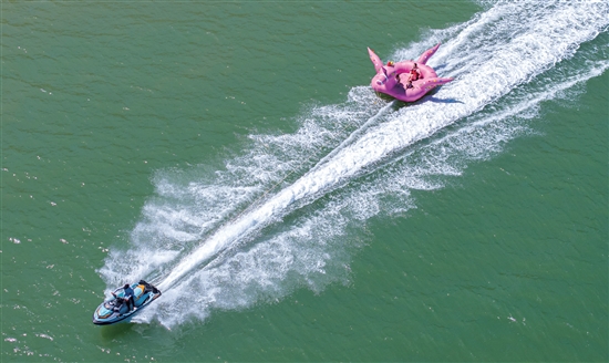 8月22日,洞下沙滩景区迎来暑期旅游高峰。海天一色间,游客们或漫步沙滩享清凉,或体验摩托艇、极速飞鱼等水上项目,亲近大海的方式越发多样。