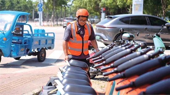 在厂区投放点,潘灵峰遇到了棘手的情况——原本规划的停车区域被私家电瓶车占得满满当当。他耐心地将这些占位的电瓶车摆放整齐,为共享电单车腾出更多空间,同时检查投放点的车辆状况,确保每辆车的电量充足。“晚高峰前必须确保每个投放点都有充足车辆,”他抹了把脸上的汗水,喘着气说,“很多人下班就靠这个回家,不能耽误他们。”