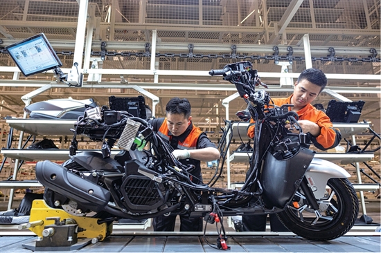 钱江摩托装配车间流水线上,工人忙着赶订单。