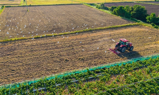 近日,在箬横镇西浦村,轰鸣的农机来回穿梭,翻耕田地,土壤中的昆虫吸引了鹭群前来觅食。它们或低空盘旋,或驻足田间,与忙碌的农机、大片的农田相互映衬,共同勾勒出一幅充满生机的生态田园画卷。