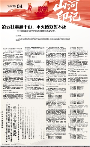 今天是中国人民抗日战争暨世界反法西斯战争胜利80周年纪念日。抗战期间,台州内外的许多诗人留下了有关台州的抗战诗词。这些诗词,展现了军民同仇敌忾的抗战精神,构成了一部微型的《台州抗战诗史》。这些作品不仅是文学瑰宝,更是研究地方抗战史的重要史料。