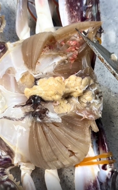 近日,网友小沈(化名)在菜场购买了四只梭子蟹,回家清洗时发现其中三只蟹鳃内部附着大量粉色颗粒物,状如“虫卵”,从外观难以辨别。该情况经网络发布后,迅速引起众多网友共鸣,大家纷纷表示曾有类似经历。