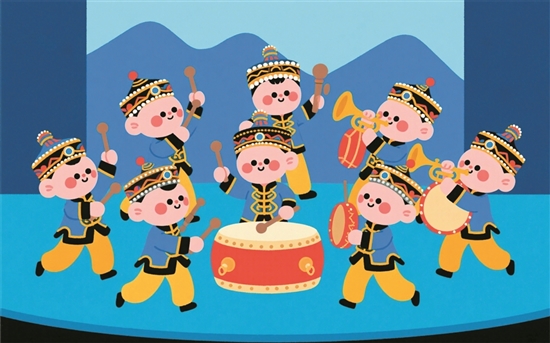 他们手里拿着鼓、锣、镲(chǎ)这些乐器,一边敲打出 “咚咚锵(qiānɡ)、咚咚锵” 的响亮节奏,一边跳着欢快的舞蹈,脚步迈得大大的,胳膊甩得高高的,看得人心里也跟着乐开花。