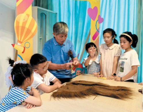 接着,他举起那根像小长矛似的蓑衣针,教我们给棕片穿孔。我屏住呼吸试了试,针“嗖”地穿过去,成就感一下子冒了出来!