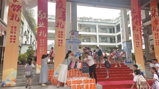 9月10日是教师节,我带着亲手制作的花,早早来到了横湖小学。一进校门,热烈的氛(fēn)围(wéi)扑面而来,处处喜气洋洋。门口的台阶上整齐摆放着一件件橙色礼物,上方立着一块醒目的牌子,写着“教师节快乐”。文明岗的同学们披着红色飘带,像精神的小士兵,热情地向大家问好。每当有老师走进校园,校长都会立刻上前,递上一份橙色礼物,轻声道一句“节日快乐”,老师们则带着这份橙色的温暖,笑意盈盈(yínɡ)地走向办公室。