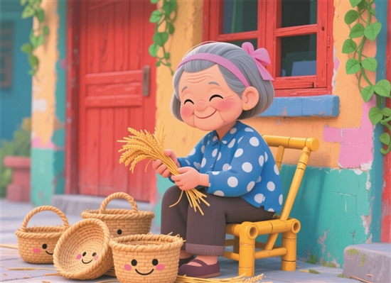 温岭草编——指尖上的“非遗技艺”:在温岭的老街上,常能看到老奶奶坐在小马扎(zhá)上,手里拿着稻草“唰唰(shuā)”地编东西,这就是神奇的温岭草编!她们的手指像变魔术一样,几根普通的稻草经过折、绕、编、扎(zhā),一会儿就变成了圆滚滚的草篮、尖顶的草帽、胖乎乎的草虾。最绝的是草编提篮,编得又密又结实,装十几斤菜都不会破,还带着淡淡的稻草香。现在年轻的手艺人还会创新,在草编上编出卡通图案、温岭风景,让老手艺变得潮(cháo)起来。摸一摸这些草编作品,粗糙(cāo)却温暖,这是温岭人指尖流淌(tǎnɡ)的智慧与温度。