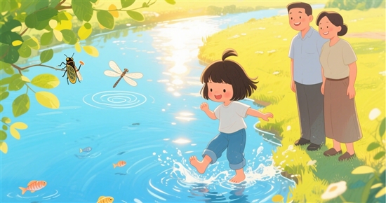 我最喜欢夏天的周末,因为爸爸妈妈会带我去小河边玩。我们挽(wǎn)起裤脚、光着脚丫踩水花,清凉的河水漾(yànɡ)起丝绸般的波纹,一群小鱼儿朝我游过来,调皮地蹭(cènɡ)着我的脚趾头,痒痒的,惹得我跳着,笑着……有时还能看到蜻蜓掠(lüè)过水面,画出一个个圆圈,真是有趣极了!