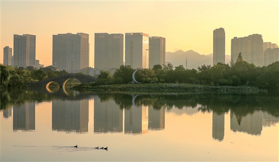 近日清晨,市区九龙湖,几只水鸟在平静的水面悠闲地游弋,与绿树、拱桥、亭台以及远处的高楼构成一幅和谐灵动的生态画卷。