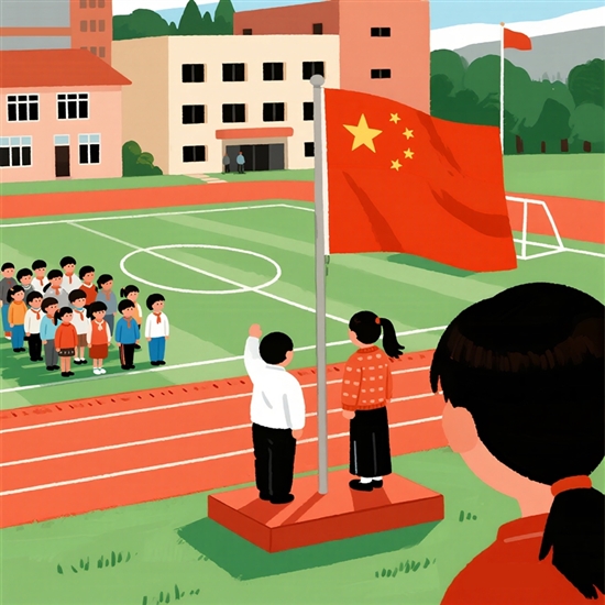 我们排着整齐的队伍,安静地走向操场。两位高年级的学长迈着有力的步伐(fá)走来。一位双手捧(pěnɡ)着叠得方方正正的国旗,另一位守护在旁边。他们神情庄重,一步一步走向旗杆。
