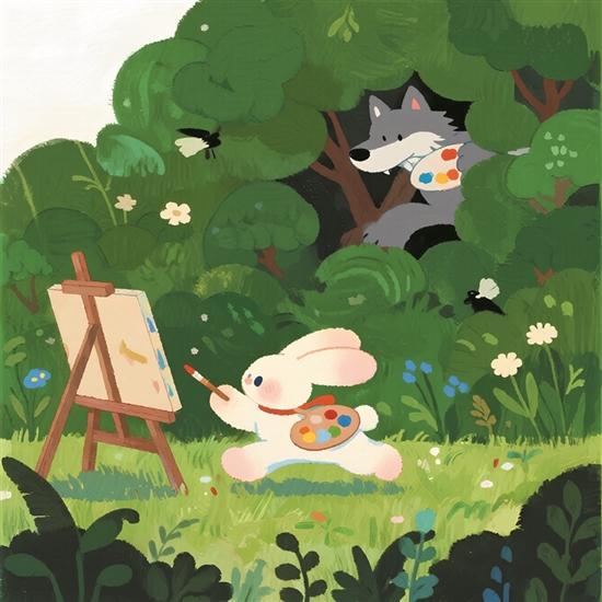 小白兔一蹦一跳地拿着调色板到草地上画画,正画起劲呢。忽然从草丛里钻出一个大脑袋——原来是恶狼,它看见小白兔肥嫩(nèn)嫩的,直流口水。恶狼从草丛跃出,向小白兔跑去。