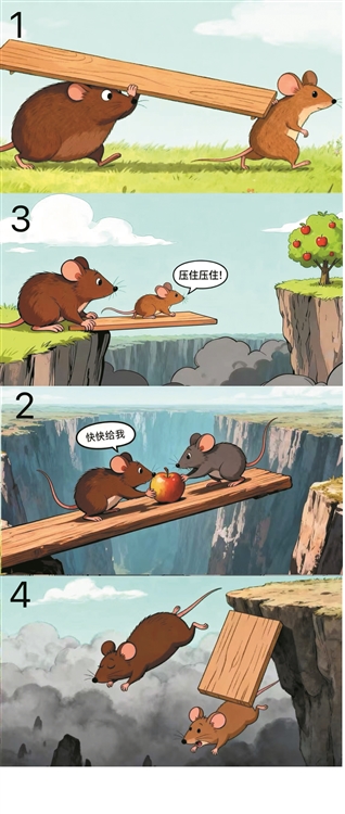 鼠大和鼠二马上跑回家扛来一块长木板,可是木板太短,只能够到悬崖的边缘。鼠二小心翼翼(yì)地走到悬崖边,低头一看,只见下面就是万丈深渊(yuān),他倒吸了一口冷气。但想到待会儿就能吃到甜丝丝的苹果,他又战战兢兢(jīnɡ)地走了起来。他一边走一边转过身对鼠大嘱(zhǔ)咐(fù)道:“圧住压住!” 鼠大蹲下屁股,死死地压住木板。鼠二颤颤(chàn)巍巍(wēi),终于来到苹果树下,他踮起脚尖,伸长手臂,摘了一个最大的红苹果,迫不及待地往自己嘴里塞。鼠大见状心急如焚(fén),说:“快给我。”边喊边噌的一声站了起来,顿时木板失去了平衡,两只可怜的小老鼠就这样掉进了万丈深渊。