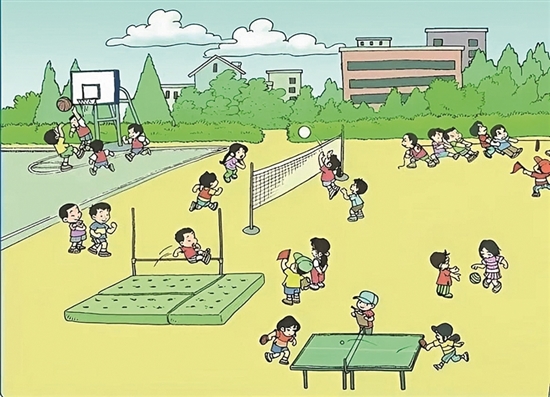 叮铃铃,下课了,同学们像潮水一般涌(yǒnɡ)进操场,有的打篮球,有的打排球,还有的踢足球……小明和小刚兴冲冲地跑到操场中央的乒乓球桌前打乒乓球了。
