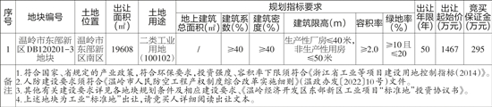 温岭市东部新区DB120201-3地块行业类别设置为:泵、阀门、压缩机及类似机械制造(该行业工序设置需符合三线一单及相关防护距离要求)。各项控制指标如下:固定资产投资强度≥270万元/亩;亩均增加值≥126.7万元/亩;亩均税收≥26万元/亩;全员劳动生产率≥16.9万元/人·年;单位能耗增加值≥4.3万元/吨标煤;单位排放增加值≥8721.08万元/吨;R&D经费支出与主营收入之比≥2.96%。