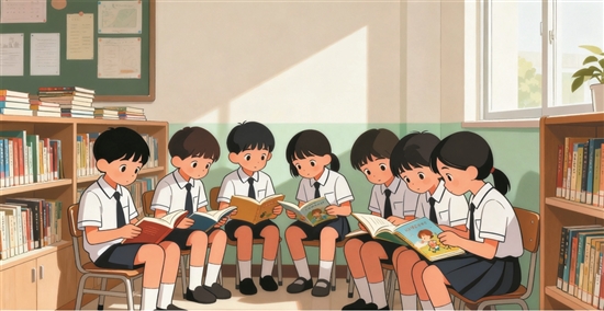 课间的时候,图书角总是最安静的地方。有的同学坐在椅子上看书,有的把头凑(còu)在一起讨论故事书里的情节。这个小小的图书角,就像一位温柔的朋友,每天都给我们带来有趣的故事,让我们在书里看到好多奇妙的世界。