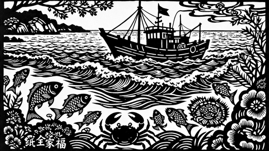 温岭的渔民伯伯每天和大海做朋友,剪纸艺术家们就把这些大海里的趣事剪进了纸里!你看,有的剪纸上是渔船乘风破浪去捕鱼,渔网里“蹦”出好多银光闪闪的鱼;有的是小螃蟹举着大钳(qián)子在沙滩上“赛跑”;还有的是浪花抱着海螺(luó)唱歌……每一张剪纸都藏着一个热闹的海洋小故事!