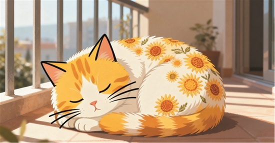 早晨,阳光暖暖地淌进屋子,一只小花猫蜷(quán)成毛茸茸的小团子,在阳台上打盹(dǔn)儿。