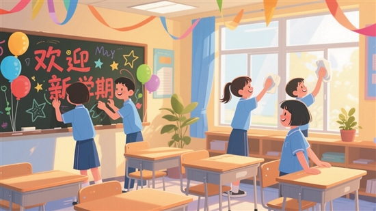 同学们像小鸟一样早早地来到教室里。因为明天就要开学了,他们要把教室打扫干净,并装扮一新迎接同学们的到来。