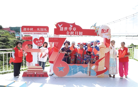 各族群众在“盛世华章,金秋月圆”主题展板前合影。