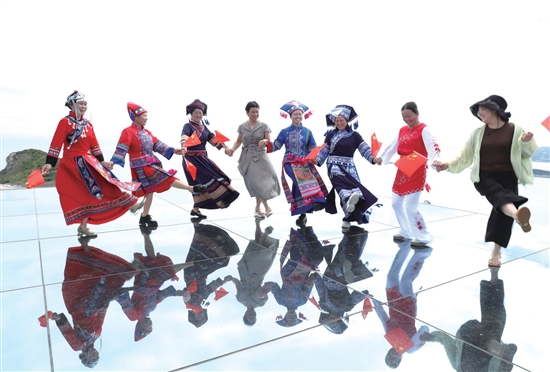 各族群众在松门山海之韵景区的天空之镜上欢快地跳起民族舞。 通讯员 江文辉 摄