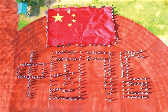 9月22日,箬横镇新区小学300多名学生走上大操场,通过托举国旗、人体拼字的方式,摆出“中国76”字样,以此祝福伟大的新中国生日快乐、繁荣昌盛。