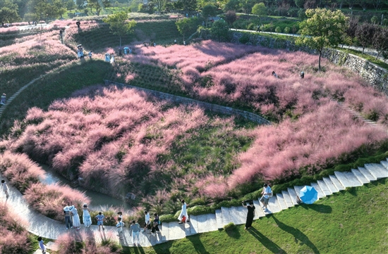 国庆与中秋佳节,植物园内大片的粉黛乱子草迎来了盛放时刻。如云似雾的粉色花海,吸引八方游客纷至沓来,享受假日带来的浪漫与惬意。