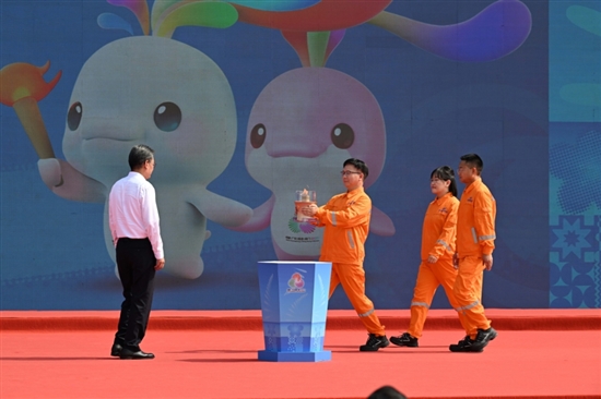 10月9日,中华人民共和国第十五届运动会、全国第十二届残疾人运动会暨第九届特殊奥林匹克运动会火种采集仪式在广东省广州市举行,负责深海采火技术研发的海洋科研工作者代表手捧从深海采集的“源火”抵达现场。(据新华社)