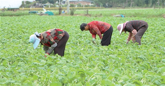 10月19日,箬横镇严家桥村一处40多亩的田地里,农民们正弓着身对高杆白菜进行疏苗作业。高杆白菜营养价值高、市场价位好,是冬春时令的“明星”蔬菜,即“白咸菜”的原料。近年来,该镇越来越多的菜农将之作为水稻轮种的优选作物进行种植,目前种植面积约800亩,预计1个月左右即可上市。