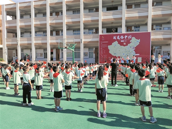 9月29日,艳阳高照,松门镇中心小学迎国庆活动气氛热烈。全校师生手中挥动着一面面鲜艳的小红旗,校园里汇聚成一片红色的海洋。