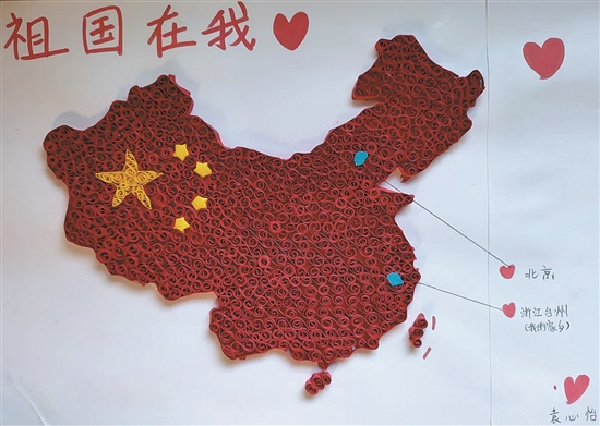 国庆节到了,我做了一幅中国地图的衍(yǎn)纸画。红色的纸卷成了祖国的样子,上面还有国旗的星星呢。我在地图上找到北京,那是祖国的首都,还有我的家乡——台州。我爱我的祖国,就像衍纸画里的红色一样热烈。国庆这天,我要对祖国说:“祖国妈妈,生日快乐!”