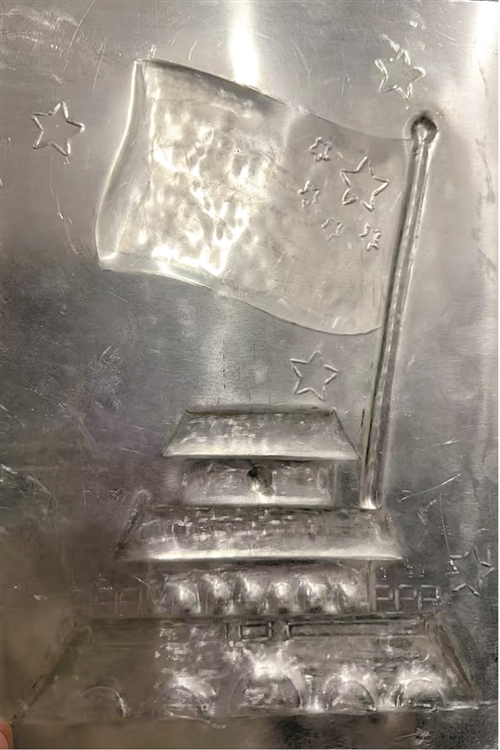 制作工艺过程:在一块A4纸大小的金属铝(lǚ)板上,手工敲出天安门城楼的立体图案,后用颜料进行填涂,干固后喷上光油防止掉色。