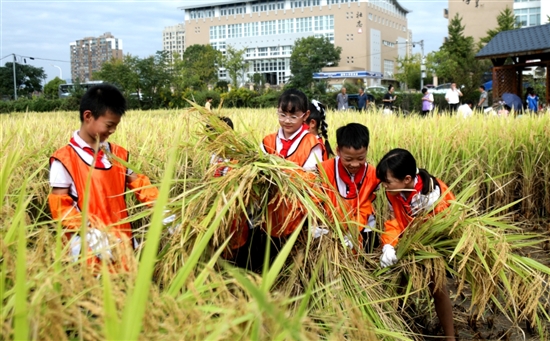 随后,学生们分组深入稻田开展收割作业。虽然动作略显生疏,但个个神情专注。随着汗水浸湿衣衫,此起彼伏的欢笑声在田野间回荡。“通过这次实践,我真正理解了粮食的来之不易。”潘郎小学学生徐昱昕擦拭着汗水对记者说。