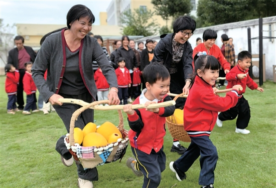 户外场地变身“欢乐竞技场”,三大趣味游戏同步开启,每一个游戏都充满了祖孙协作的暖心细节。蔬菜套圈环节,爷爷们眯着眼睛瞄准目标,孩子们在一旁帮忙递圈,还小声提醒“爷爷,往左边一点,那个萝卜离得近”。赶鸡入笼游戏里,孩子们握着赶鸡棒,却总把气球赶偏,奶奶们便蹲下身,手把手教孩子调整力度和方向,“慢慢来,轻轻推,气球就听话了”。秋收运粮项目中,祖孙俩共同抬着装满“粮食”的篮子,孩子小胳膊用力往上抬,想帮长辈分担重量,爷爷则悄悄把篮子往自己这边挪,减轻孩子的负担;走不稳时,两人互相搀扶着稳步前进,“共担”的意识就在这一抬一扶间,悄悄在孩子们心中萌芽。